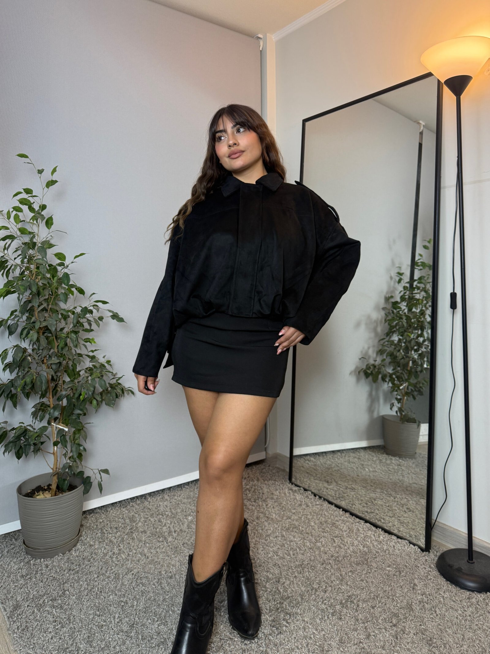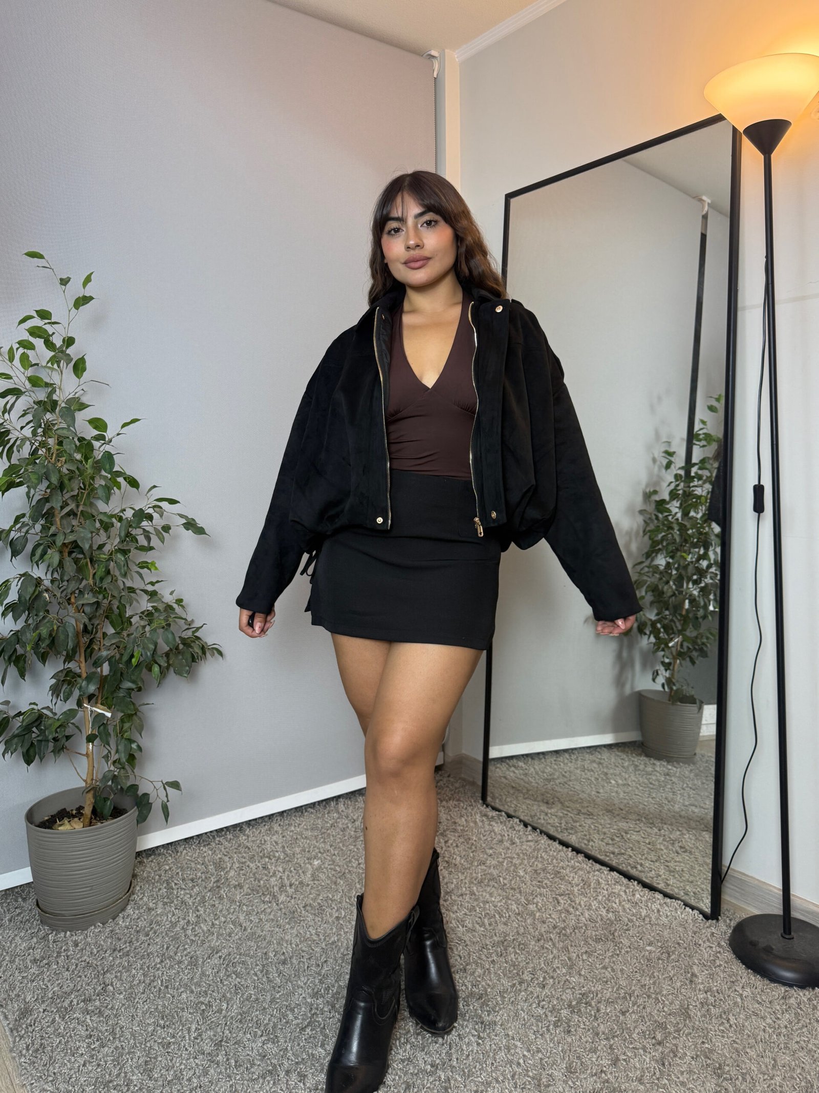 Hermosa chaqueta estilo aviadora en suede premium color café, perfecta para elevar cualquier outfit esta temporada. Su diseño moderno y elegante combina perfecto con jeans, faldas o vestidos, entregando un look sofisticado y versátil.