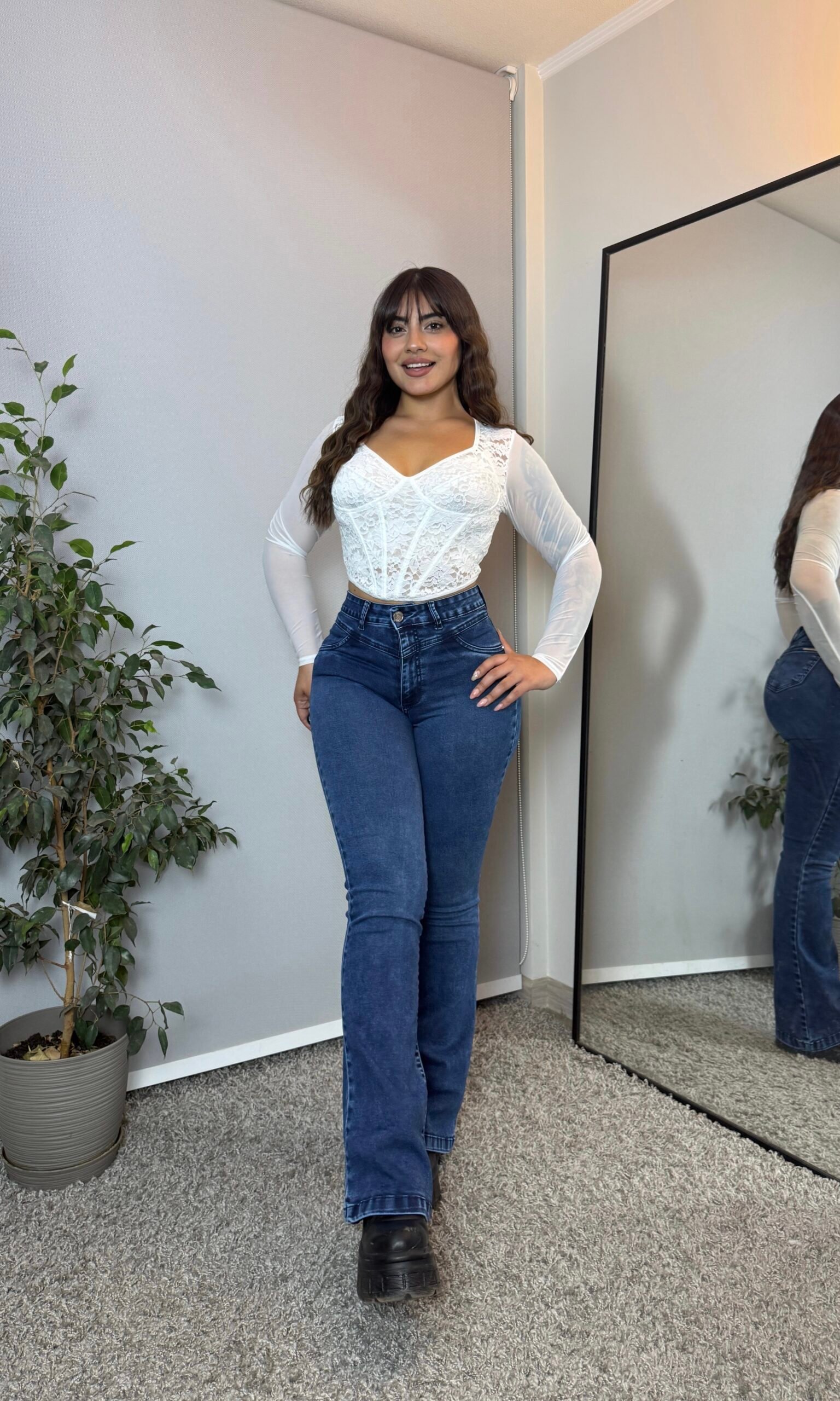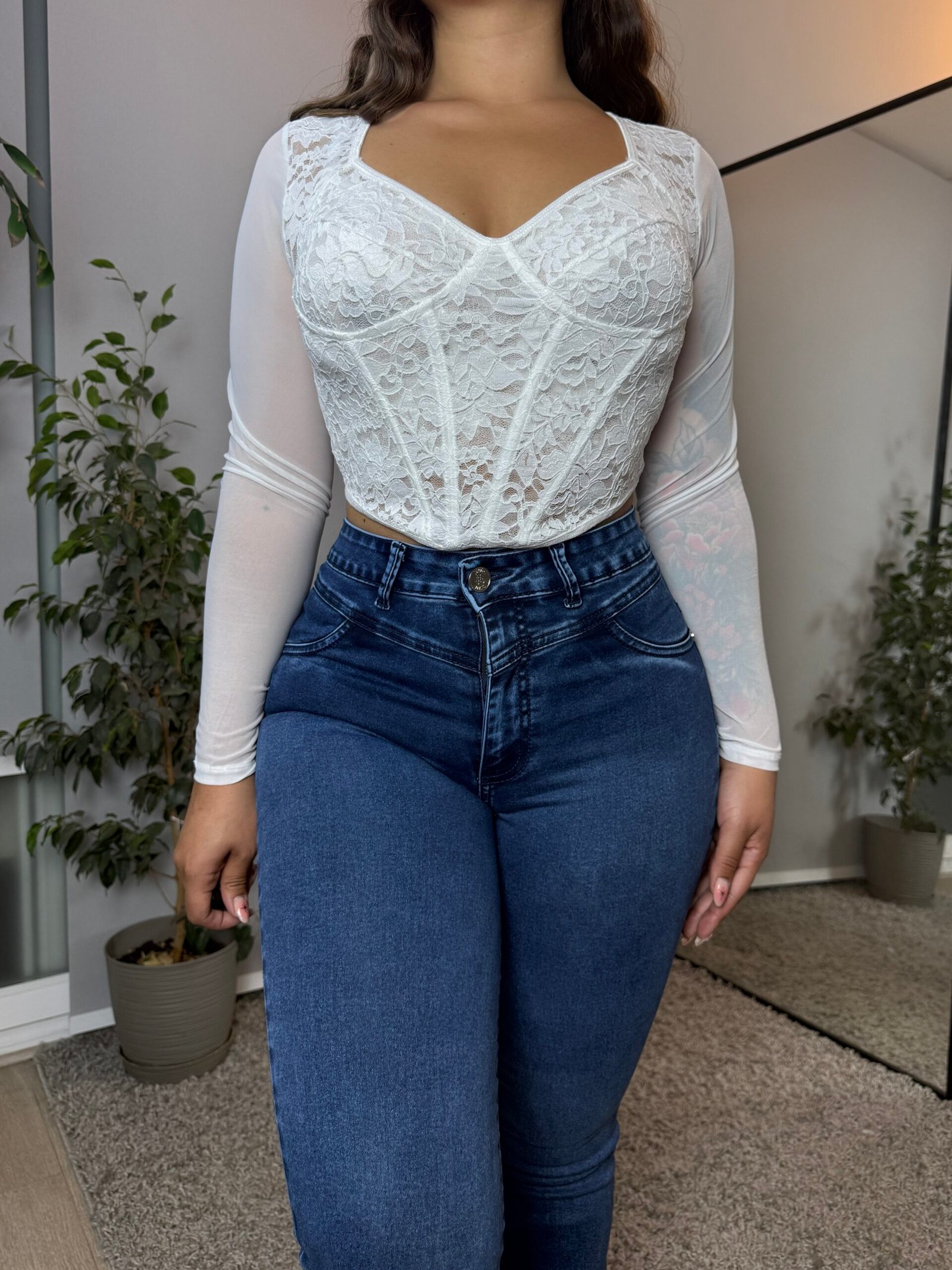 Hermoso crop top de encaje delicado, diseñado para realzar la figura con un estilo elegante y femenino. Cuenta con copas tipo corset que estilizan el busto y mangas largas en tela suave que aportan un look sofisticado.