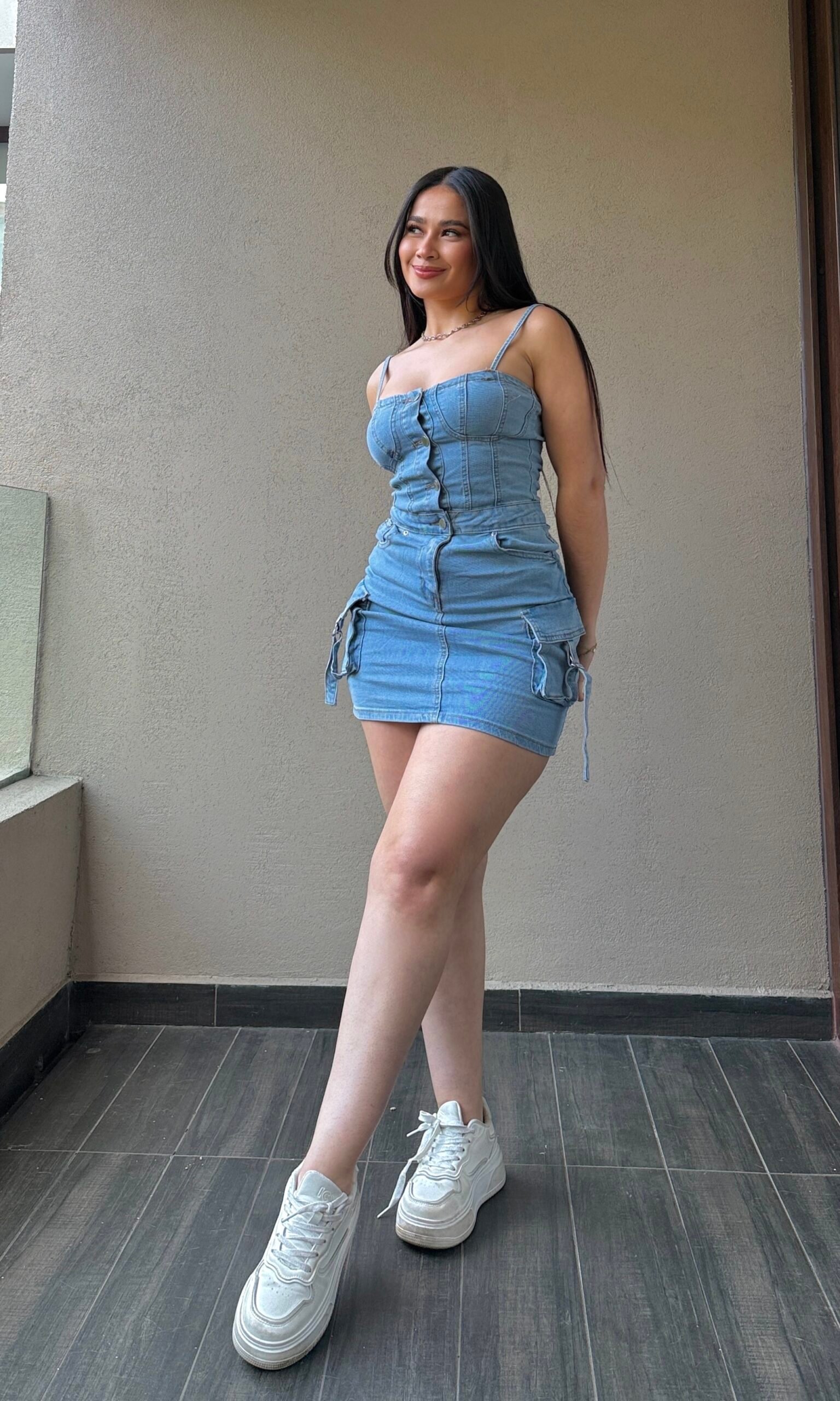 Color azul denim, elasticado y con calce perfecto. Disponible en tallas S (36/38) y M (40/42). Nuestra modelo usa talla S. Ideal para un look casual y a la vez chic 🌸
