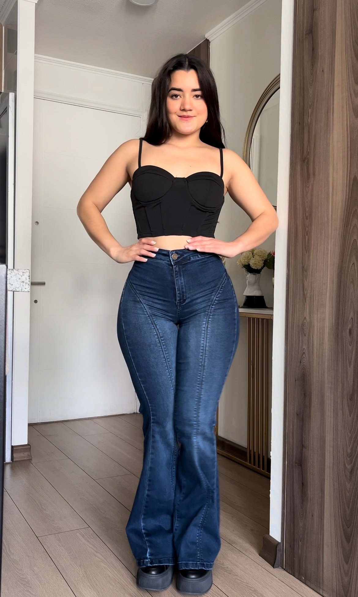 Con corte flare desde la rodilla hacia abajo, crean un movimiento fluido y elegante que alarga visualmente las piernas, mientras que el tiro alto y efecto push up moldean tus curvas con sutileza, elevando tu silueta y realzando tu figura con naturalidad. Su tono azul vibrante es versátil y sofisticado, ideal para looks casuales, semi-formales o incluso eventos más arreglados.