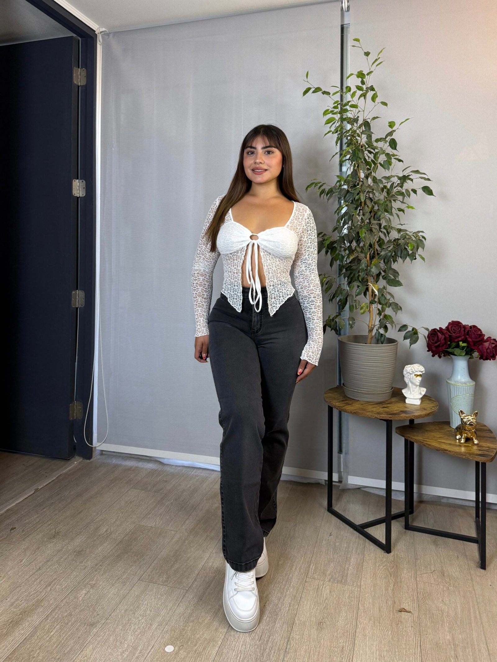 Blusa BLANCA Encaje Glam Amarra Delantera | Mangas Largas, Ajustable, Estilo Ganzy | Envรญos a Chile