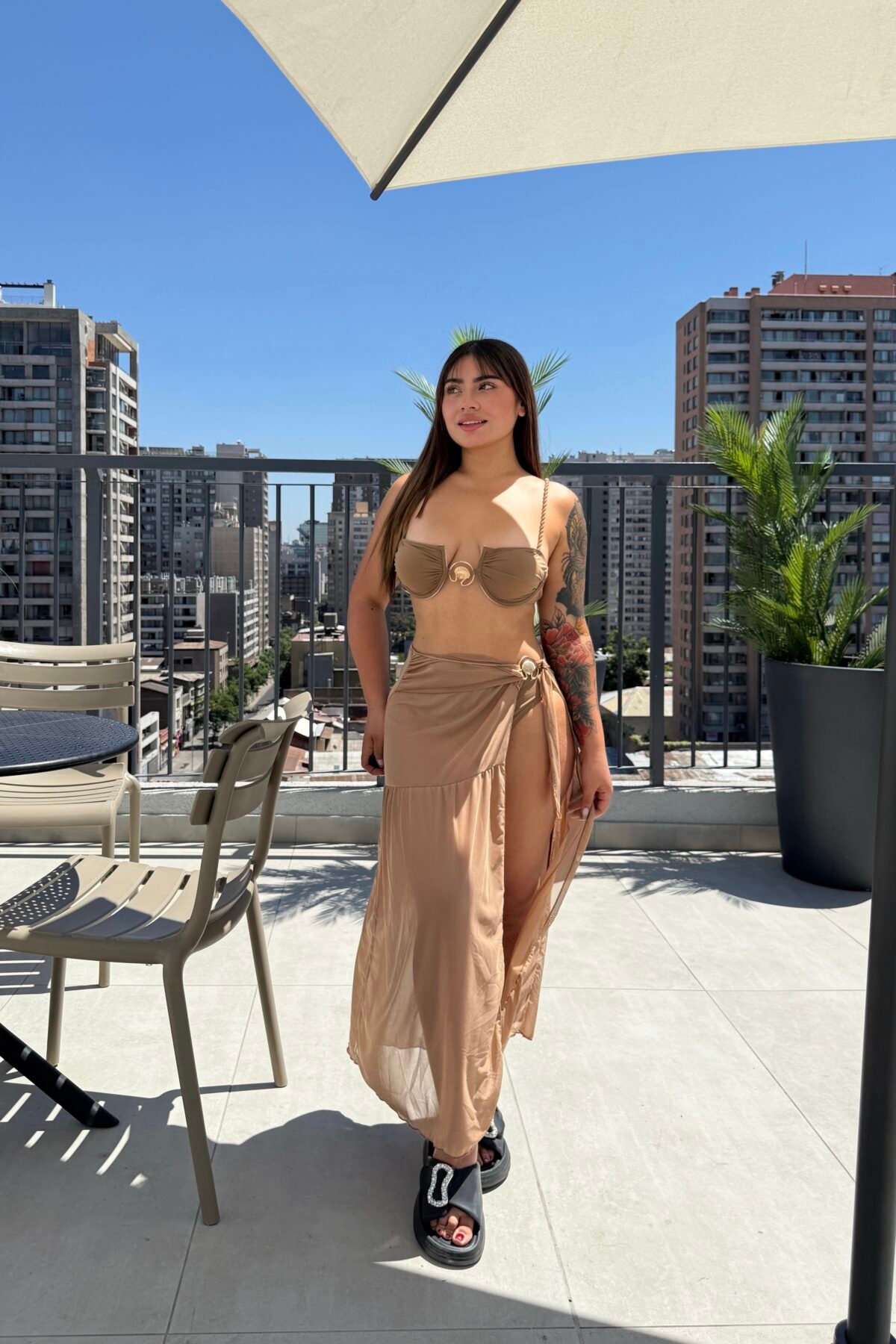 Set Diosa del Desierto Café – 3 Piezas Premium | Top con Copa, Falda Elasticada, Elegancia Terrosa | Envíos a Chile