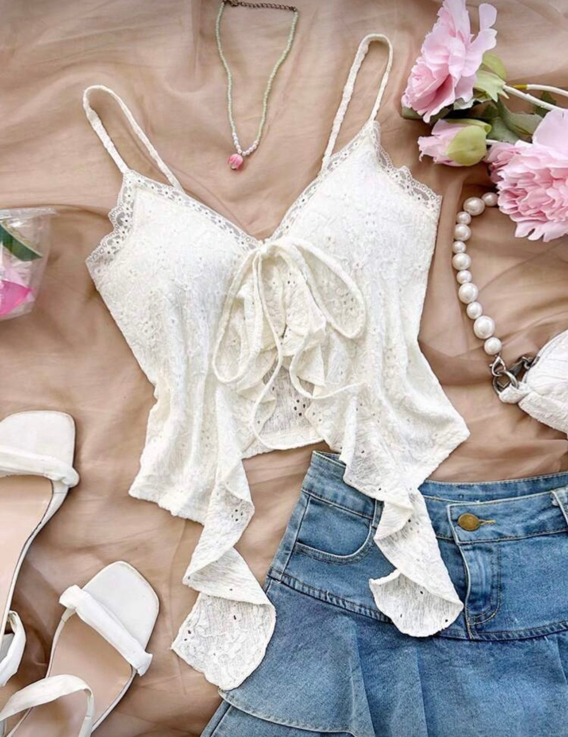 Blusa BLANCA Encaje Glam Amarra Delantera | Mangas Largas, Ajustable, Estilo Ganzy | Envíos a Chile